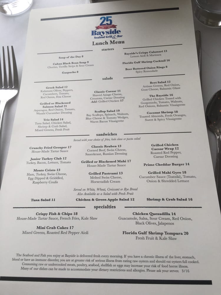 Bayside Seafood Grill & Bar is a must-visit restaurant located in Naples, Florida. With a diverse menu offering American cuisine with a focus on seafood, this establishment caters to all preferences. Customers rave about the attentive service provided by servers like Atillio and Jared, who ensure a memorable dining experience. The Chef's Special, featuring Mahi-Mahi Tacos and Bayside Chicken Salad, receives high praise for its flavorful and well-executed dishes. The restaurant's waterfront location provides a stunning backdrop for enjoying delicious meals, making it a favorite spot for both locals and visitors. From the impeccable food presentation to the excellent service, Bayside Seafood Grill & Bar stands out as a top choice for those craving exceptional seafood in a classy yet casual setting.